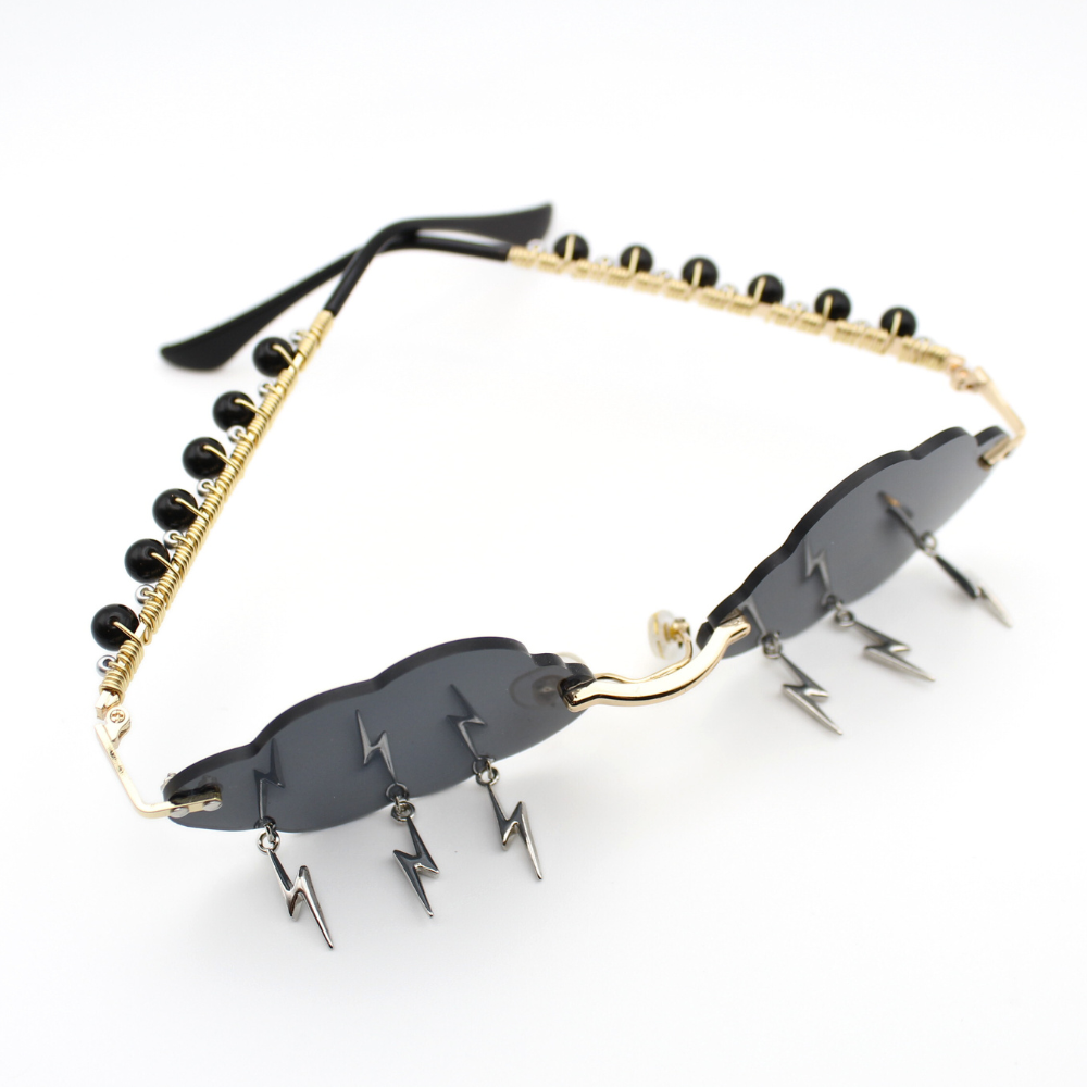 These black cloud-shaped sunglasses are anything but ordinary. The arms are wrapped in gold wire and finished with genuine black obsidian beads — a stone known for its grounding and protective properties. Traditionally used to help repel negative energy and shield the wearer, black obsidian adds intention behind the edge.